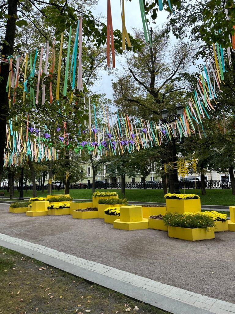 Where was the photo taken with the yellow flower boxes?