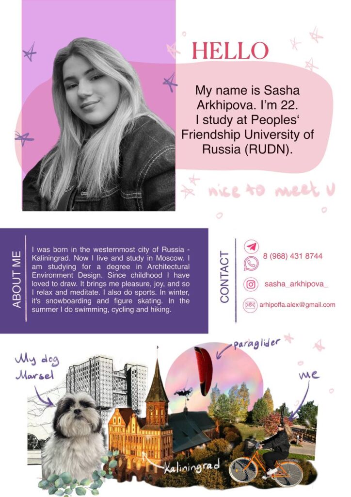Let me introduce myself. My name is Aleksandra. But my friends call me Sasha. Im 22. I come from Kaliningrad. It is located in the west of the country Now I live in Moscow. I am a fifth-year student at the Peoples’ Friendship University of Russia. Architectural environment design. am a communicative person and I have a lot of friends. My best qualities are cheerful, enthusiastic, friendly, optimistic and reliable. But sometimes I can be lazy and reckless.