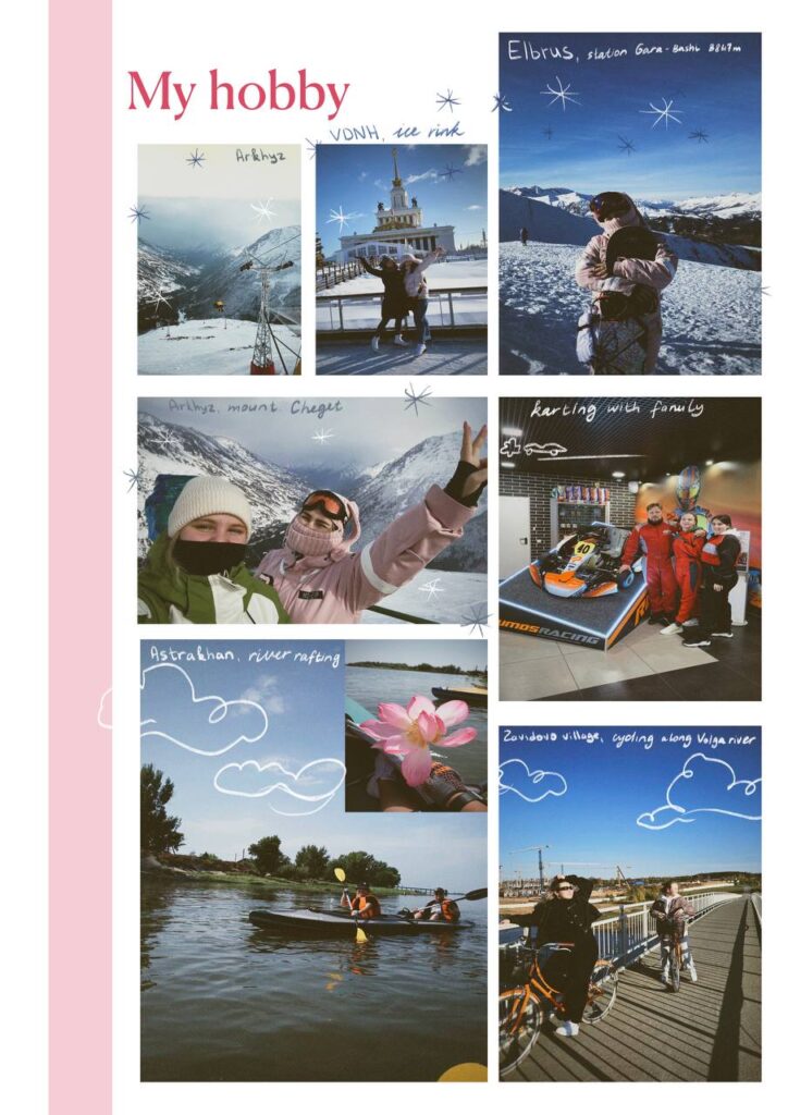 Now I would like to tell you about my hobbies. I am interested in learning new languages (Russian, English, German, Italien), traveling, reading, art and architecture. I do sports in my free time or holidays. «Healthy body, healthy mind»(If your body is fit and healthy then so is your mind.) Snowboarding, cycling, ice skating, river rafting, swimming. And of course I draw. This gives me great satisfaction and peace.