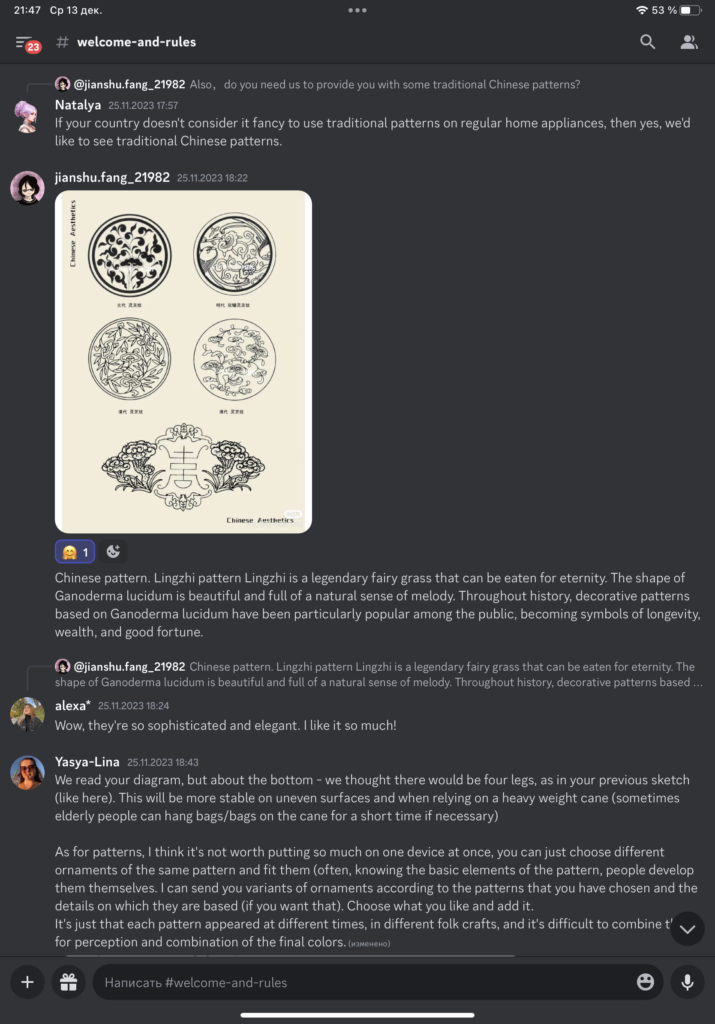 Working days… Post author:alexandra17 Post published:13 December 2023 Post category:Uncategorised Post comments:0 Comments We actively communicated with our friends from Team 15. We asked about characteristics of Chinese culture, patterns and colors. We have learned a lot of new and different things for us. Read more articles Previous PostCommunication process Next Postfinal board…from team 7 You Might Also Like final video 13 December 2023 Hello! Team 15! This our Feedback 13 December 2023 Initial Design Brief 31 October 2023 Leave a Reply Cancel replyCommentEnter your name or username to comment Enter your email address to comment Enter your website URL (optional) Save my name, email, and website in this browser for the next time I comment. Δ