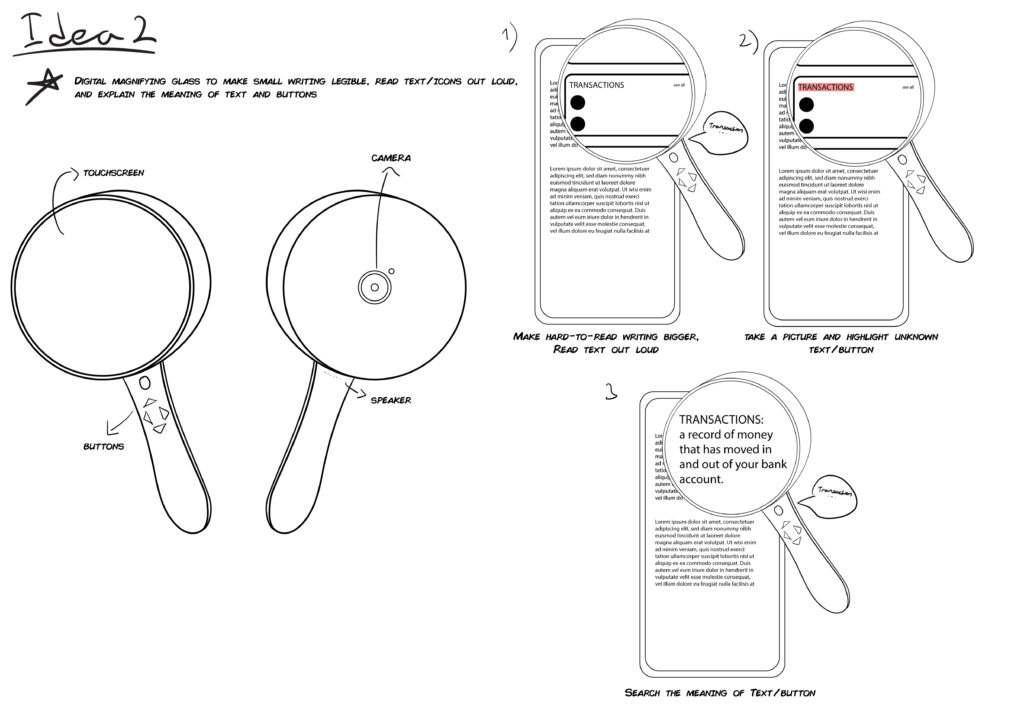 This one, the digital magnifying glass, is a helper device designed to aid the elderly as they are using the devices they already have. They can magnify, hear the voiceover and research the meaning of texts and buttons, and take pictures for future reference. Helps the elderly learn the written, visual, and practical language of any and every device, website, or application.