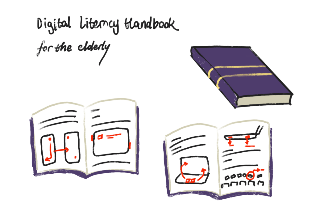 Since the elderly is not famliar with technology at all we can introduce them a good old solution that they are familiar with: reading! With a hardback handbook design they will be able to learn essential technology and digital literacy tips that are specialized for their wants and needs. Since the handbook will cover any device that they may interact with, they will be able to practice the info they learn on the devices they own.