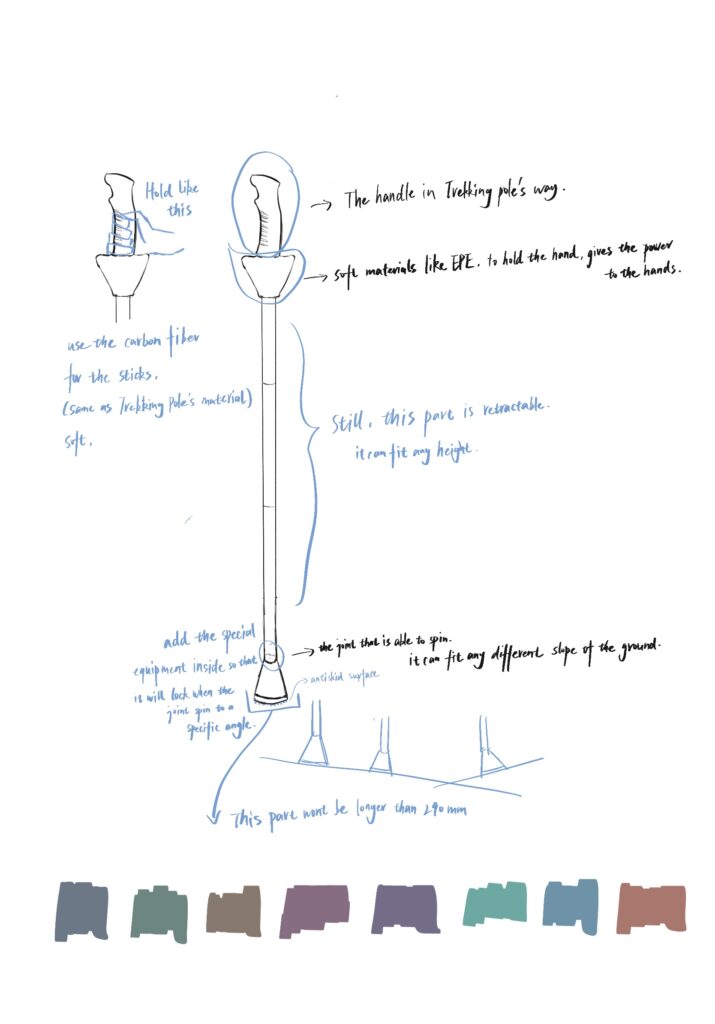 I make the handle of the stick in trekking pole’s way, to make the wrist feel less pressure. Also i add a soft materials under the handle. it can hold the hand, so the user wont feel pain on her/he side of the hands.